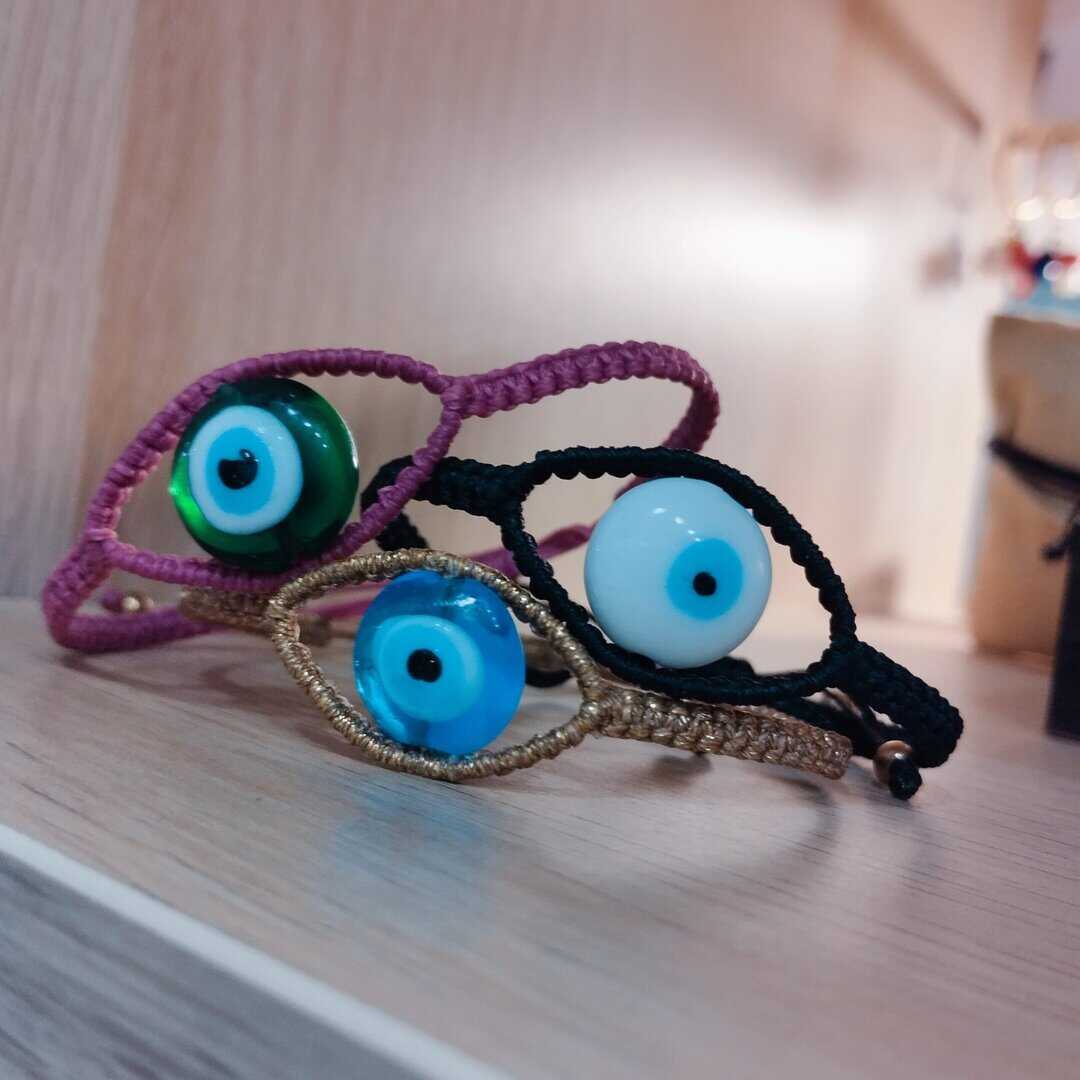 Απλά μάτια με κεντρικό γυάλινο μάτι σε διάφορα χρώματα και πλέξη μακραμέ.