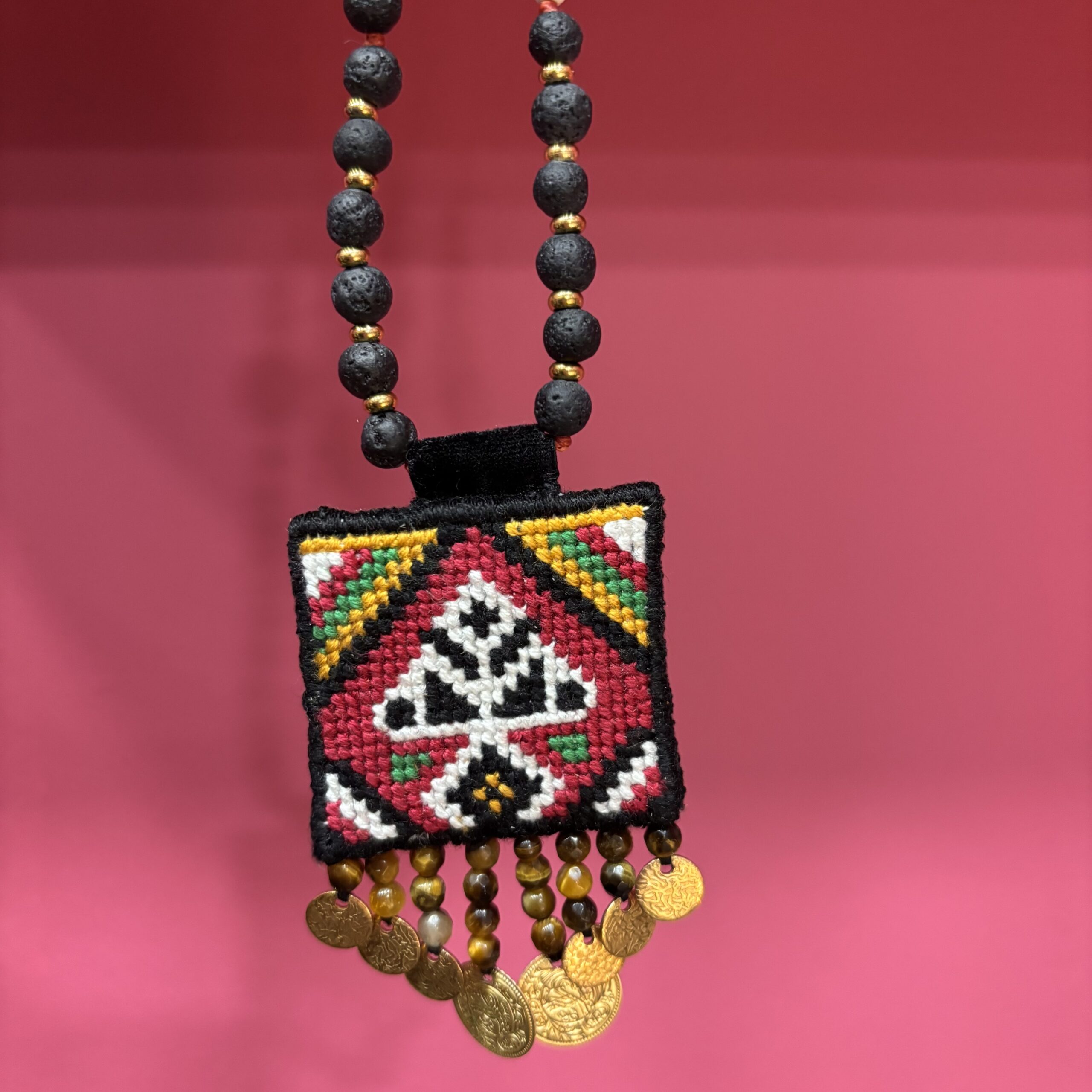 Μοναδικό κολιέ με κέντημα σταυροβελονιά εμπνευσμένο από μοτίφ φορεσιάς από το λαογραφικό μουσείο Ξάνθης.
