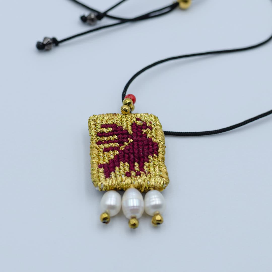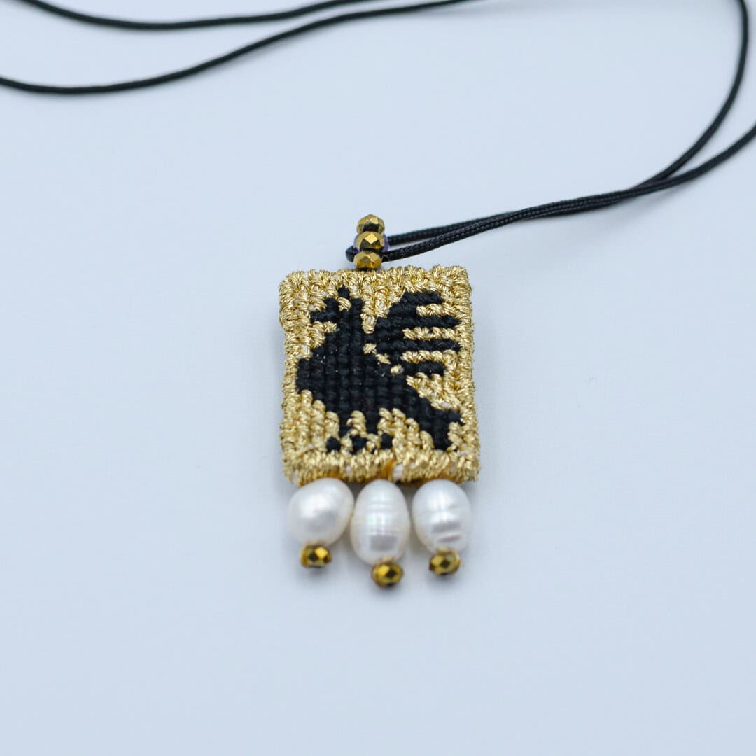 Μαργαριταράκια γλυκού νερού κεντημένα στο κάτω μέρος του φυλαχτού.