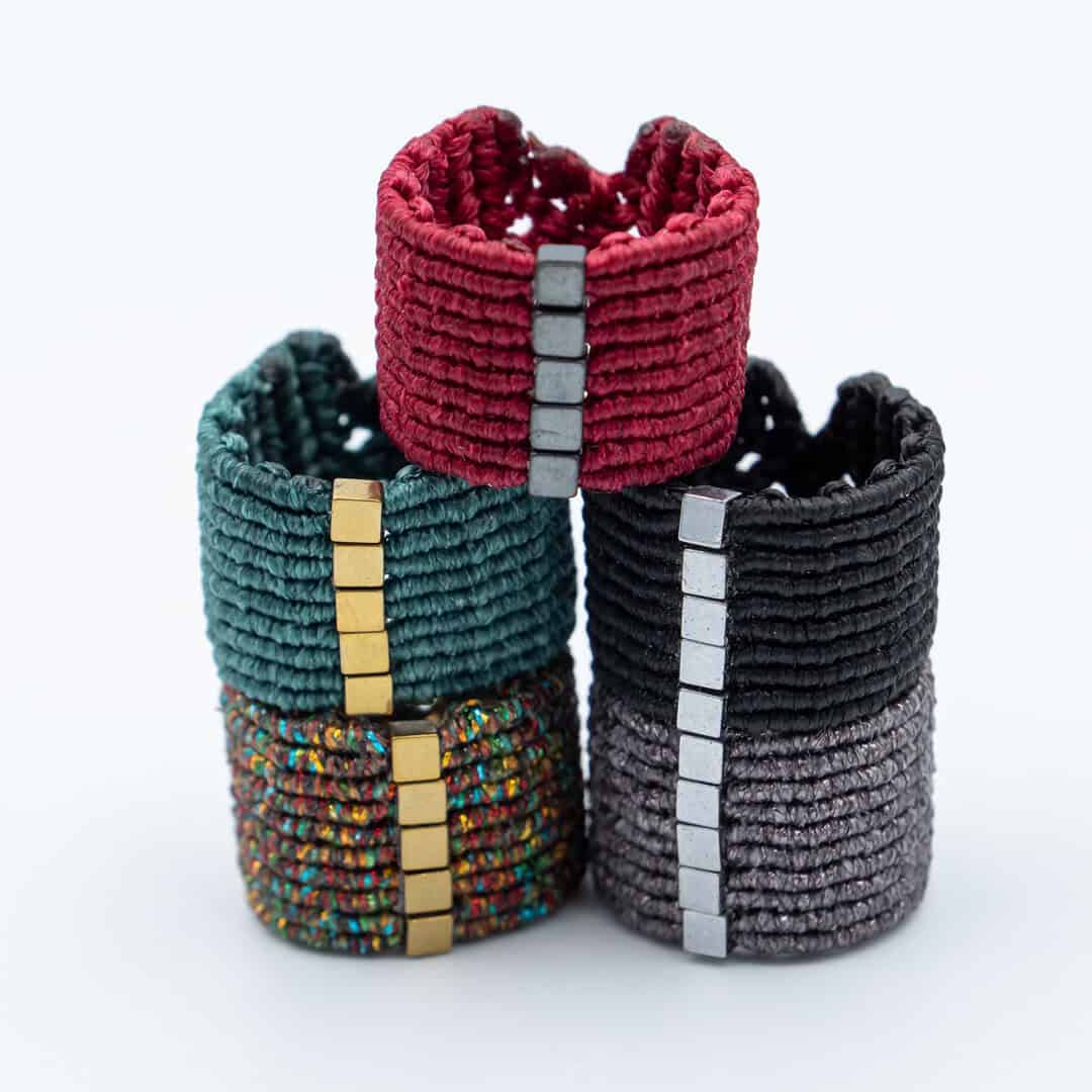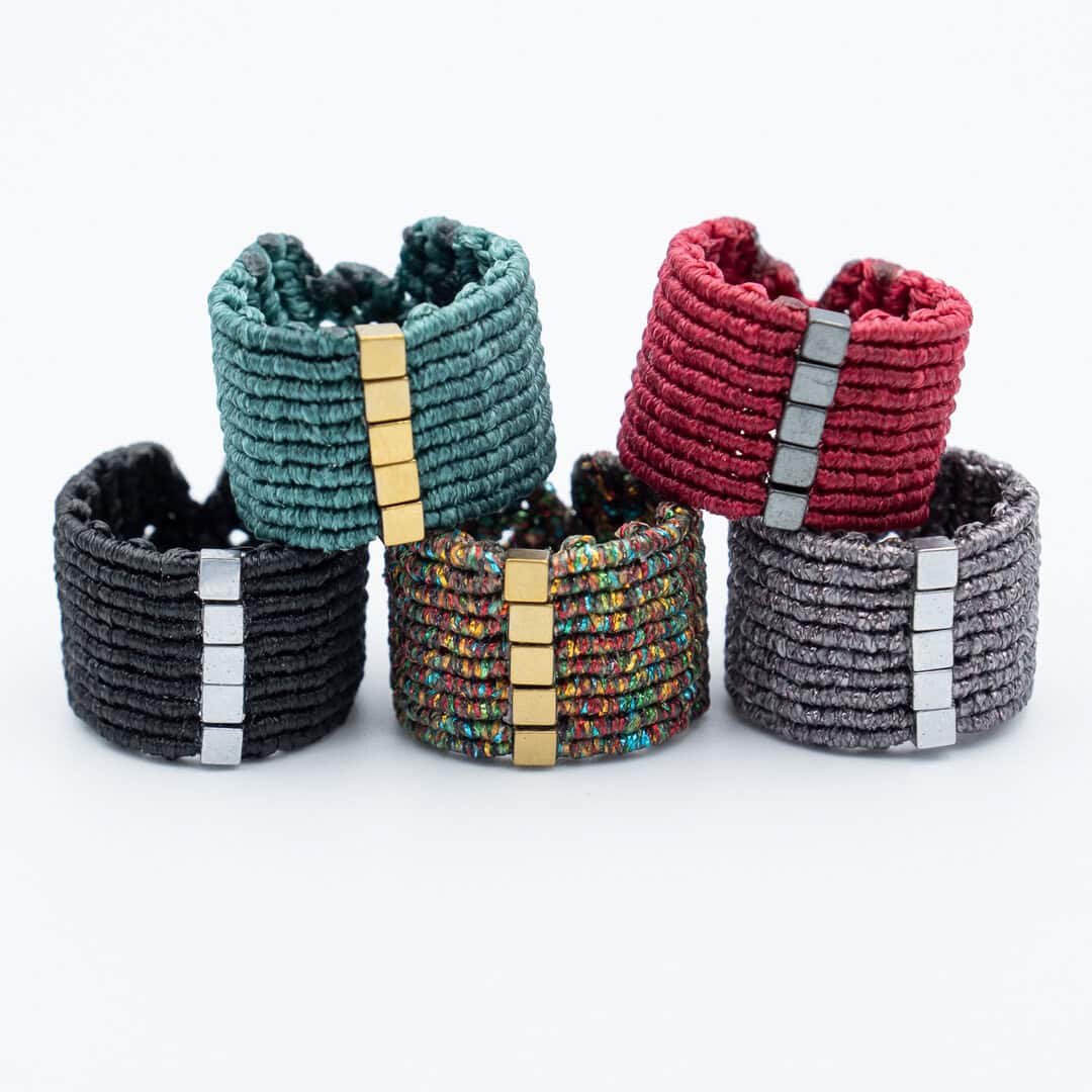 Τα φετινά δαχτυλίδια μας με την τεχνική μακραμέ είναι στολισμένα διακριτικά με μία σειρά αιματίτη.