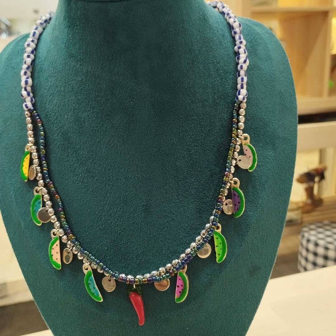 - ΚΟΝΤΟ κολιέ με δύο σειρές από μικρές γυάλινες χάντρες , αιματίτες και φρούτα από σμάλτο και γυαλί. Φλουράκια από ανοξείδωτο ατσάλι και κούμπωμα ατσάλινο συμπληρώνουν το κολιέ. Το μήκος του στα 50 εκατοστά περίπου.