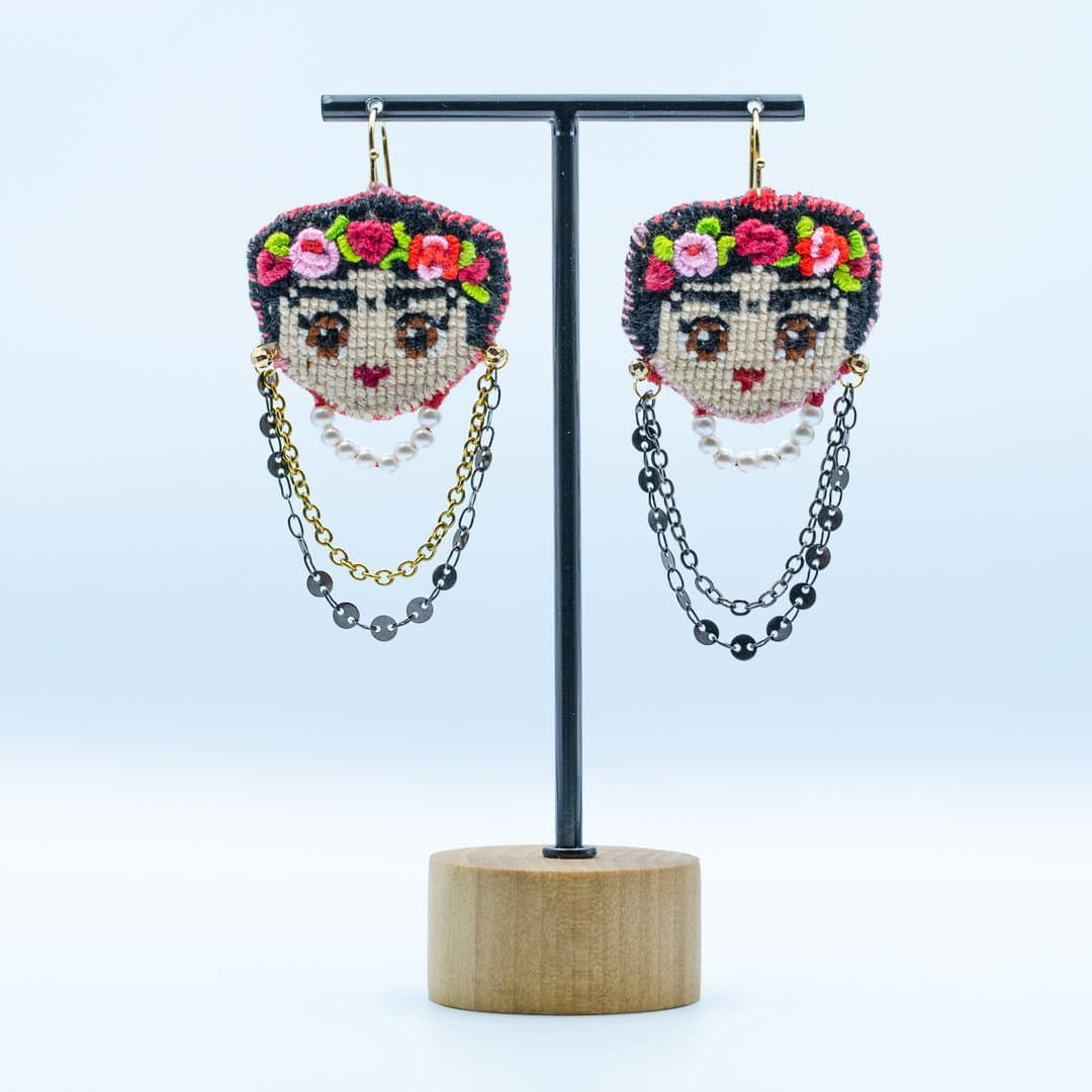 Φανταστικά σκουλαρίκια κεφάλι Φρίντα με πέρλες κολιέ και αλυσιδάκια ατσάλινα.